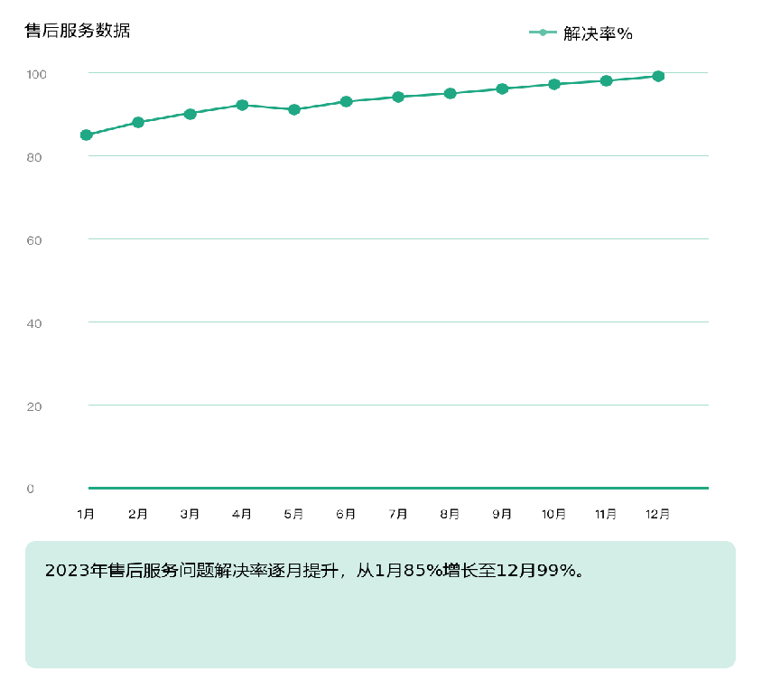 2023年售后服務(wù)問(wèn)題解決率逐月提升,從1月85%增長(zhǎng)至12月99%,顯示出持續(xù)改進(jìn)的成效。